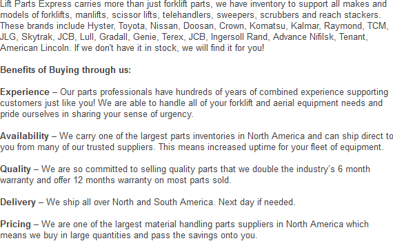 All our forklift parts are offered at the best prices. Call today to get a quote on one of the parts or attachments we offer. Call us at: